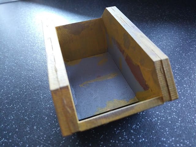 A little while back I bought some TT Combat mdf kits for my Urban Project. These included the Bus Stops, Play Park and Refuse Skips. I finally got around to putting a couple of the bits together and I thought I'd start with a quick win - the skips. These are a really nice kit and for £4 I think a real bargain. I have two gripes only, firstly and this is only a minor thing - they have branded the side of the skips with company names, this is fine but it means I was unable to use the name of local companies to me which would have been more meaningful for my very local campaign. Secondly and most importantly - the scale, these kits are big! billed as suitable for 28mm - 32mm they are definitely on the top end of that scale! clearly aimed at the Knights Models games Batman the Miniatures Game and the like. Come on TT Combat, there are a lot of other games out there other than BMTMG! It goes to show the scale creep that is really prevalent in modern miniatures gaming at the moment. Anyway the negatives to one side, I actually really like the models and they are dead simple to put together and to paint. They also gave me a chance to practice some new (for me) weathering techniques. So this is how I did it, don't forget that this was the first time I did these techniques so be gentle....